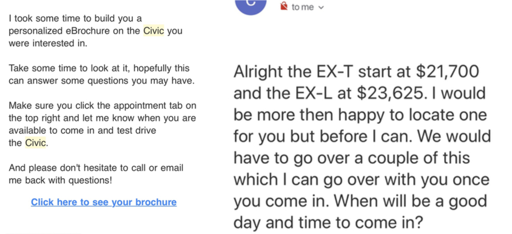 "I do not want to waste our time. Once the price is right, I am willing to visit you and take the car as soon as possible. Please provide me the best out-door-price. I am looking forward to getting your response through email."