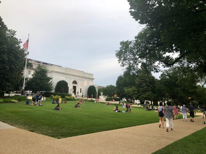 National Mall 들어가는 입구 맞은편에 잔디에 자리 잡은 사람들이 보이네요~
